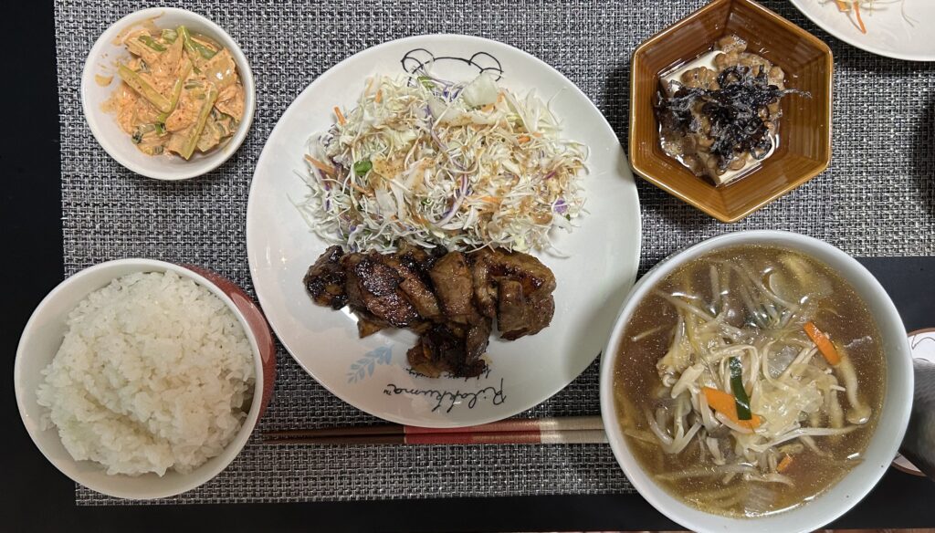 今日の夕食は①ご飯②野菜スープ③トンテキ④冷奴⑤キムチ和えでした。トンテキと野菜スープがうますぎて、いつもはご飯を二杯食べるんですが、三杯食いました。限界まで食いました。腹一杯です。食べ過ぎるのも悪いですが、うまい飯を作る方も悪いと思います。かといって上手くなかったら困りますけんども。