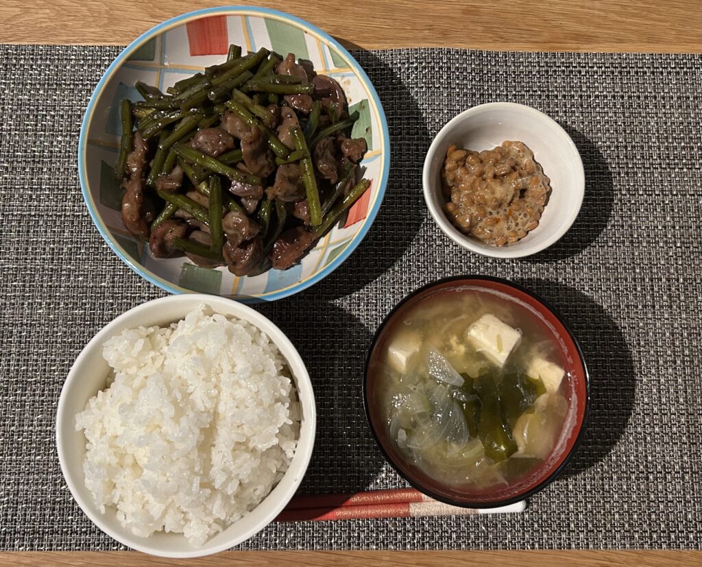 今日の夕食は①ご飯②味噌汁③納豆④砂肝とニンニクの芽の炒め物でした。④はスーパーで焼くだけのものを買って食べましたが、完全に飲兵衛用の味付けでした笑 でもめっちゃうまいし、砂肝もニンニクの芽も好きなのでガツガツ食ってしまいました。酒あったら最高でしたね。そんな飲めないっすけど。