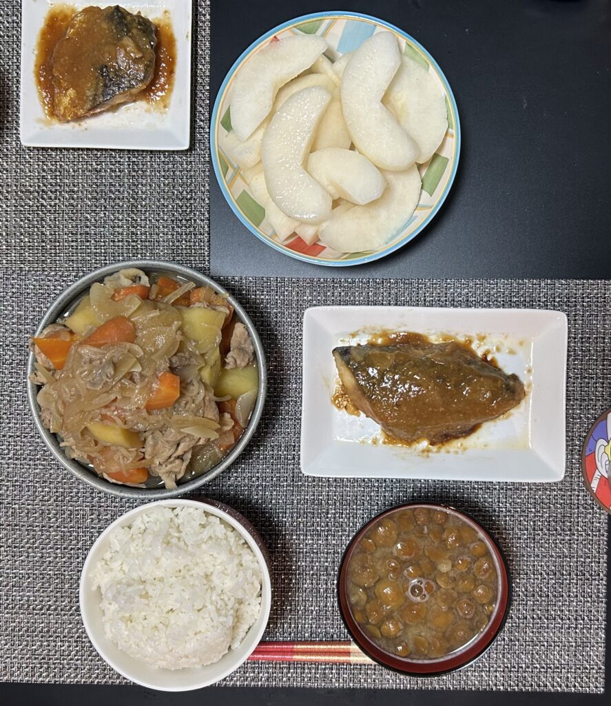 今日の夕食は、①ご飯②なめこ汁③鯖の味噌煮④肉じゃが⑤梨でした。今日は自分の好物のオンパレードでした。ただ絶対に肉じゃがを作りすぎです笑