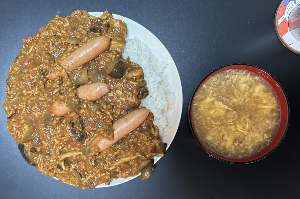 今日の夕食は①激盛り無水キーマカレー②フカヒレスープでした。自分はカレー三日分いけると思ったんですけど、彼女様の感覚的には二日分だったらしく、結果的に無理やり持ったら写真の通りになりました。もう溢れてますわ。どういう感覚してんすかまじで笑