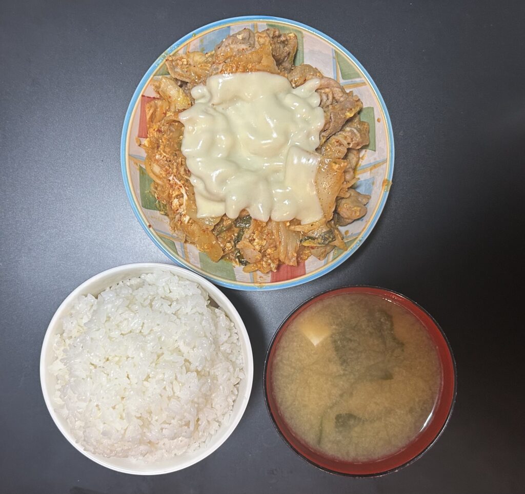 今日の夕食は①ご飯②味噌汁③豚キムチでした。豚キムチは自作で、チーズとニンニクをこんもり入れました。まじでハイカロリー飯です。食い終わった頃には苦しいのはもちろんですが、クラクラしました。やりすぎました笑