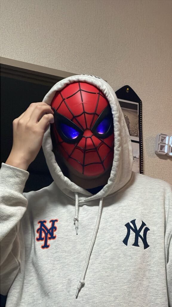 2万円の買い物のうちの1つで約4000円でスパイダーマンのお面を購入しました。目の部分を開閉することができて、光るっていうテンション爆上げ商品でした。楽しすぎるこれ笑 ただ、少しサイズが小さいので長時間はつけていられなそうです。笑