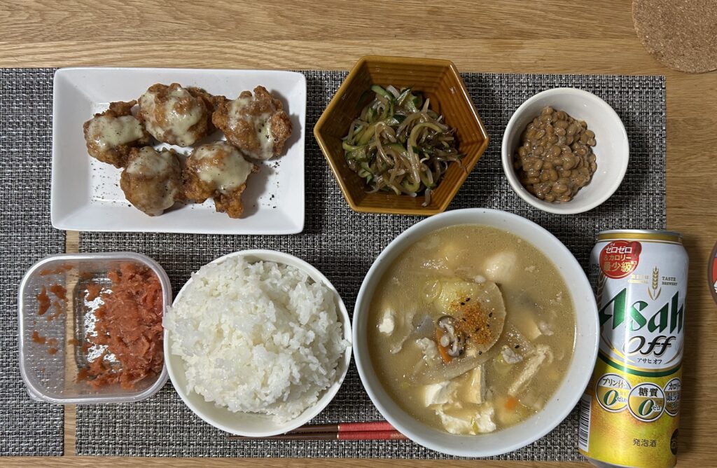 今日の夕食は①ご飯②豚汁③納豆④ナムル⑤からあげ⑥じゃこ明太です。少し体を気にした酒を買ってきやした。唐揚げも帰りに買ってきました。流石にストレス発散とはいえ食い過ぎました。まじで苦しいっす。でも、全部うまくて幸せです本当に笑