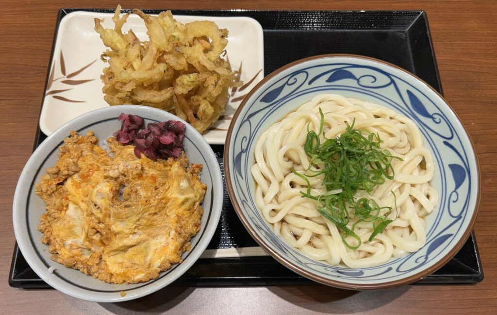 今日の夕食は「丸亀製麺」でぶっかけうどん(大)とそぼろ丼と野菜かき揚げを頼みました。いつも通りのぶっかけうどんとかき揚げのセットに加えて、目に留まったそぼろ丼を頼みました。いつものセットは安定で上手くて次に行ったとしてもまたこれを頼むと思います。また、そぼろ丼は初めて頼みましたが、ピリ辛と言いつつ甘めの味付けで、美味しいんですけど個人的にはリピ無しかなと思います。