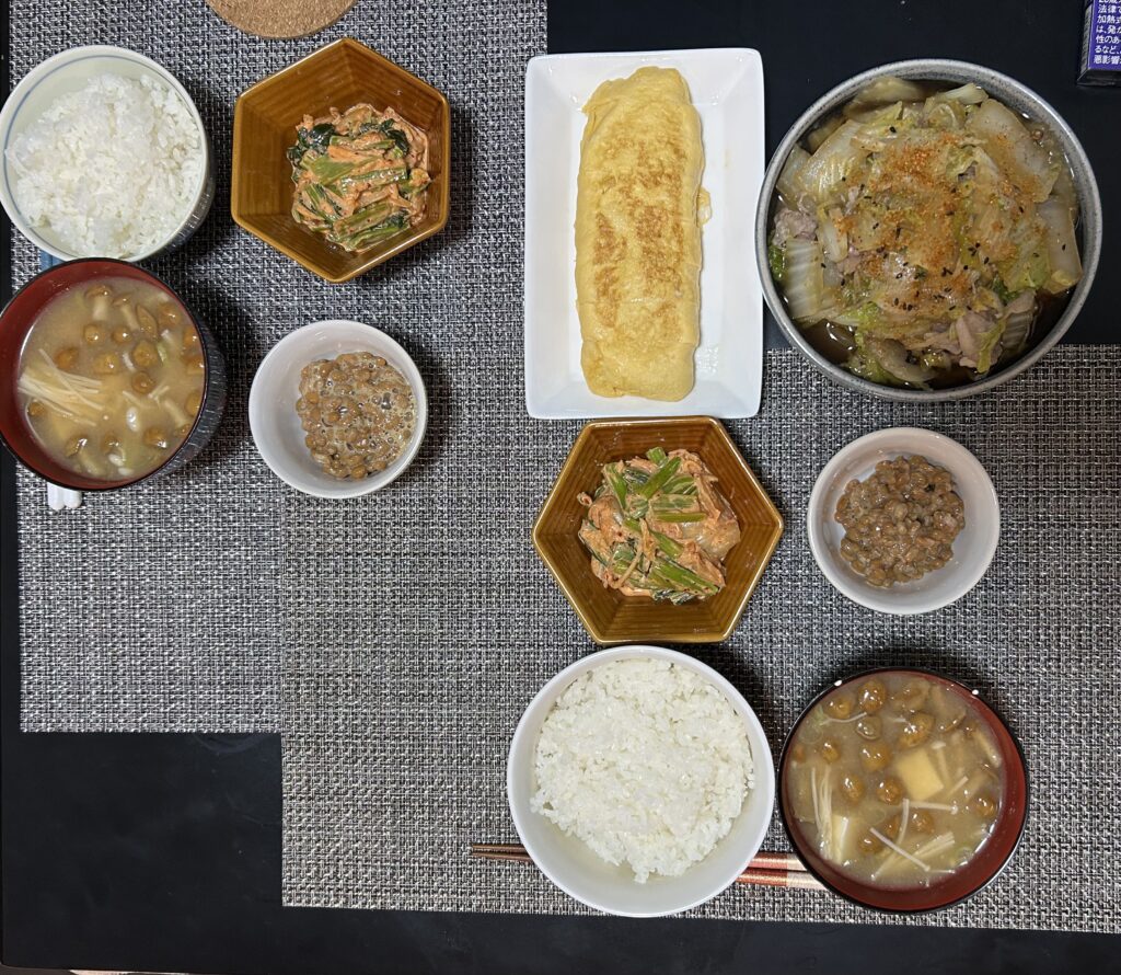 今日の夕食は①ご飯②なめこ汁③納豆④小松菜のキムチ和え⑤白菜と豚肉のトロトロ煮⑥卵焼きでした。久しぶりの彼女様のご飯美味かったです〜。卵焼きの中にはチーズが入っていて絶品でしたし、トロトロ煮も本当にとろとろしていて絶品でした。米の量気をつけようと思ったのに、我慢できずにおかわりしました。完全に彼女様にやられました。