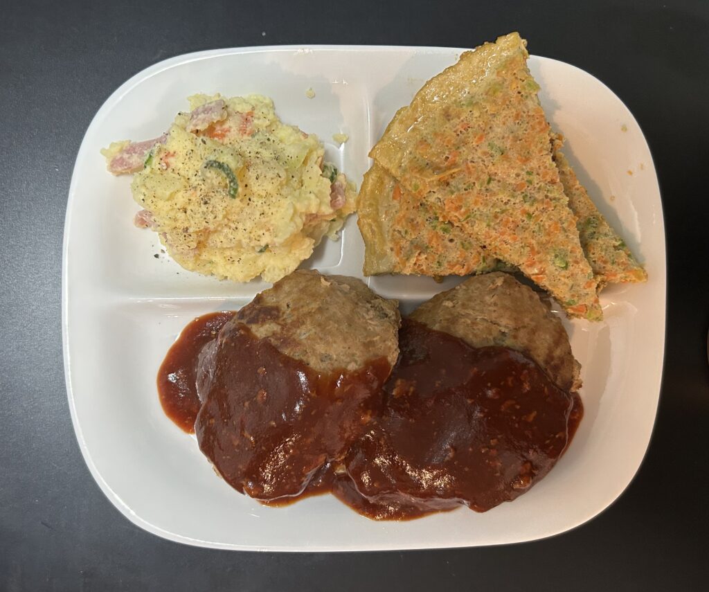 今日の夕食は①ご飯②ハンバーグ③オムレツ(実家式)④ポテトサラダです。ハンバーグは彼女様作で、やはりでっかいっすね。大満足ですけど笑