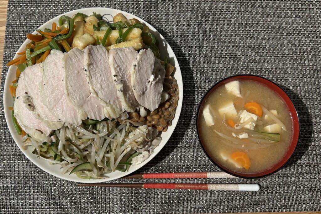 今日の夕食は①激盛り丼②味噌汁です。今日は、今週外食しすぎて冷蔵庫の食材が限界近かったので、彼女様が本気を出して、食材全部を使った夕食を作ってくれましたが、イカれているボリュームになりました笑 よく食えたと自分でも思っています笑