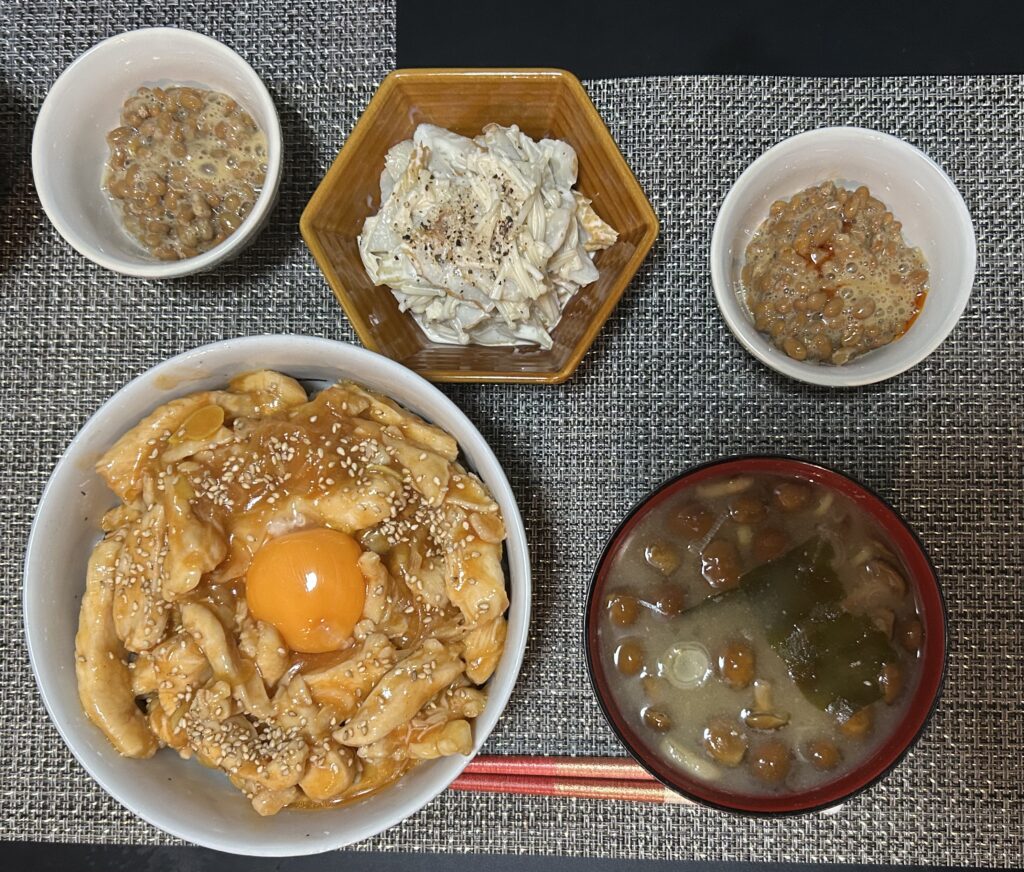 今日の夕食は①鶏胸肉のユッケ丼②なめこ汁③納豆④榎とちくわの和物でした。今日も飯がうまい!!彼女様の飯なかったら、もう廃人になってます。これ食うためにむかつきながら仕事やってるようなもんです。