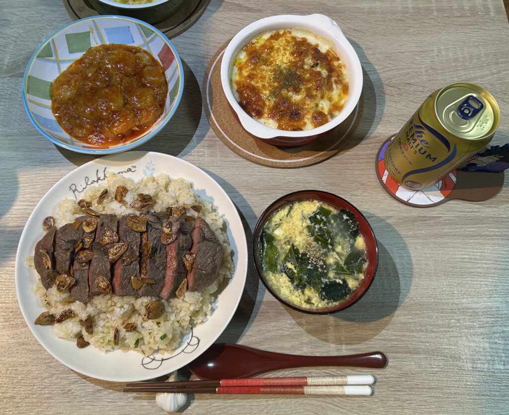 今日の夕食は①ガーリックライス②ステーキ③卵スープ④グラタン⑤エビチリでした。今日は誕生日ということもあって、自分が食べたいと言っていたものを作ってくれて、豪華でした。本当にありがとうございました。誕生日忘れてピックルボールしようとしてましたけど、やっぱ誕生日はいい日ですわ。