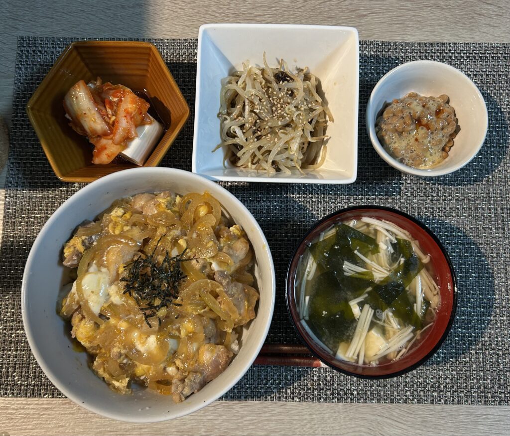 今日の夕食は①親子丼②味噌汁③納豆④ナムル⑤冷奴でした。今日は、一昨日と同じくこめの量を200gで食べました。食べる前は少ないなぁと思いますが、ゆっくり食べるとしっかり満腹になれます。今日も夕食が美味しいからかもしれません。最高だ。