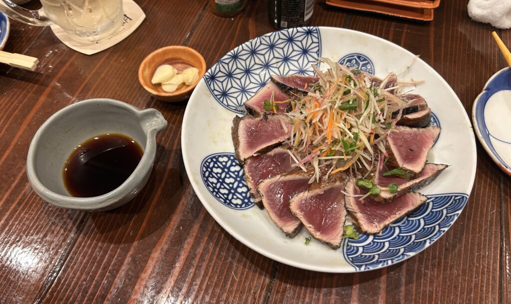 今日の夕食はお気に入りの「矢三郎」で食べて酒を飲みました。本当は焼肉を食べる予定でしたが、付近の店は予約は待っている人でいっぱいで諦めました。ちなみに写真は一番うまかった鰹のタタキを載せときました。どの料理もハイクオリティで良店です。笑