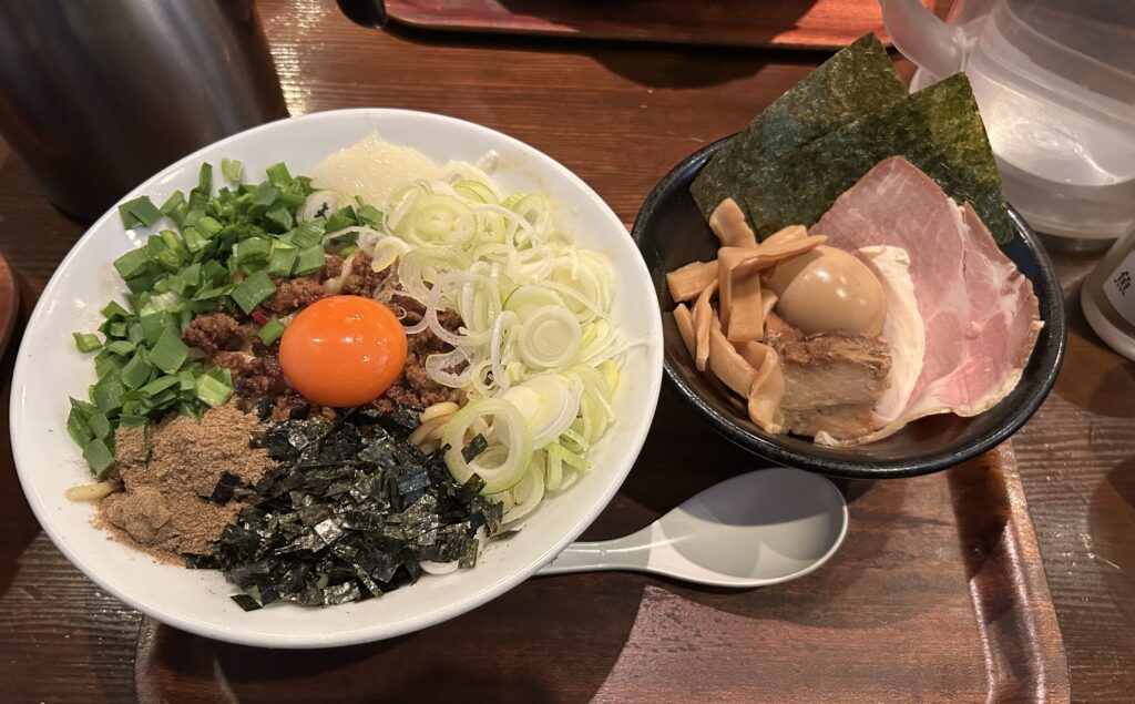 今日の昼食は「つけ麺屋 しずく」で台湾まぜそば(¥1,400)を食べました。つけ麺屋さんですが、一番人気がこちらのメニューで、前々からこれしか食ってなかったので、こちらを食べました。大盛りも値段そのままでできて、がっつり食べました。追い飯もついてきて、最高にボリューミーでした。久しぶりに苦しくなるくらい食いました。ごっちゃんです☺️