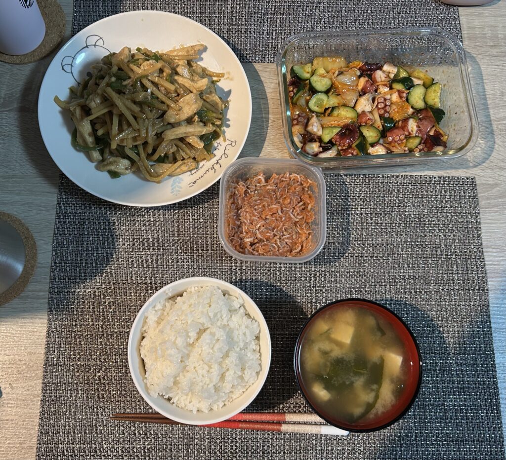 今日の夕食は①ご飯②味噌汁③じゃこ明太④たこキムチ⑤青椒肉絲でした。今日も彼女様が腕を奮って美味しいご飯を作ってくれました。なんか、暇だったからこそ疲れて、より一層上手く感じましたし、酒も飲んじゃったし、ご飯も久しぶりにおかわりしちゃいました。痩せれんわ。こりゃ。