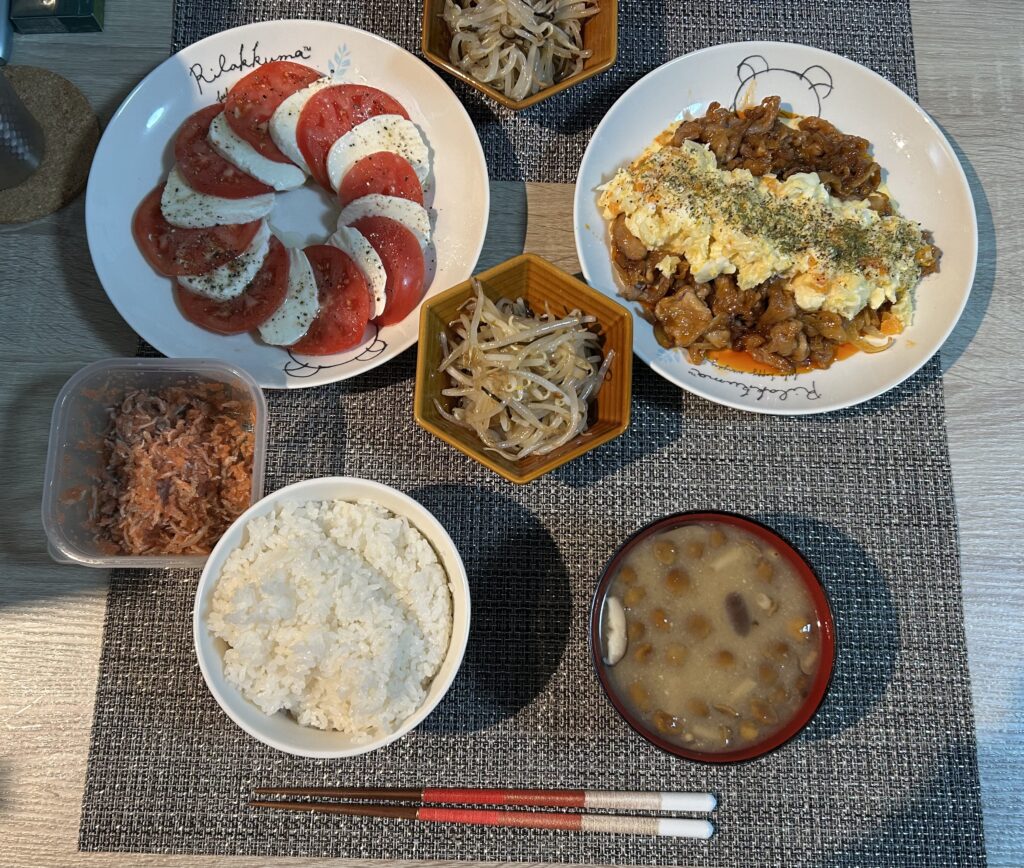 今日の夕食は①ご飯②なめこ汁③ナムル④じゃこ明太⑤カプレーゼ⑥ケチャップ炒め(笑)だそうです。