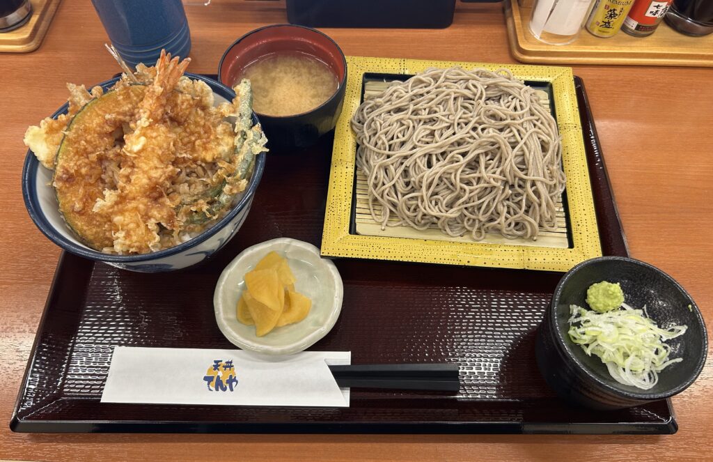 まずは、「てんや」に行って天丼大盛りとそば大盛りのセットを頼んでたらふく食いました。タレも多めにして。幸福感が半端ない飯でした。脳汁出ましたわ。